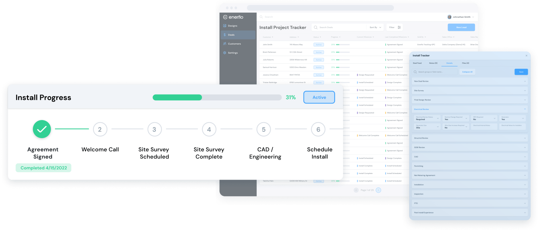 The Enerflo Install Tracker has your back, giving everyone involved the visibility they need to follow their installation progress, access data, build reports and more. Better yet, the data can be powered by your favorite CRM, or simply use our tools out of the box.